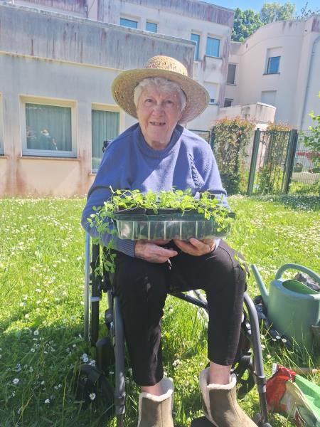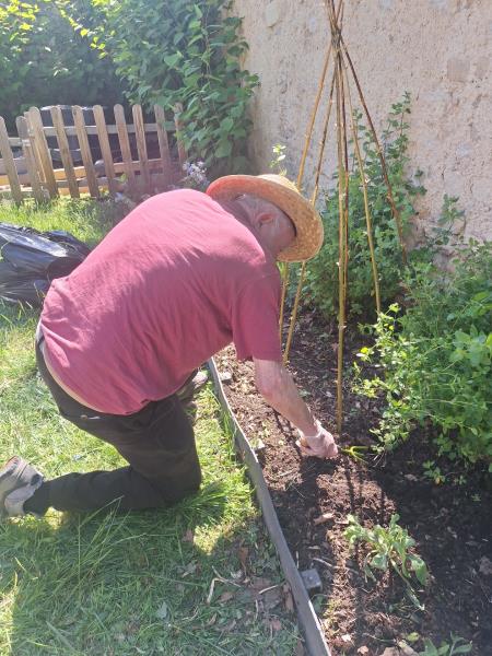 Quelques résidents ont commencé à rafraîchir nos par-terres de fleurs mellifères en compagnie de Stéphanie, soignante. Ils en ont profité pour y planter des semis de pois de senteur, préparés au préalable lors d'un précédent atelier.